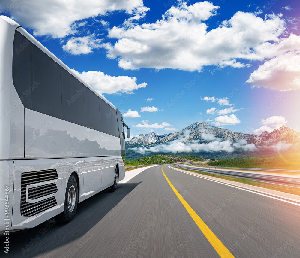 A white tourist bus travels along a picturesque mountain road.