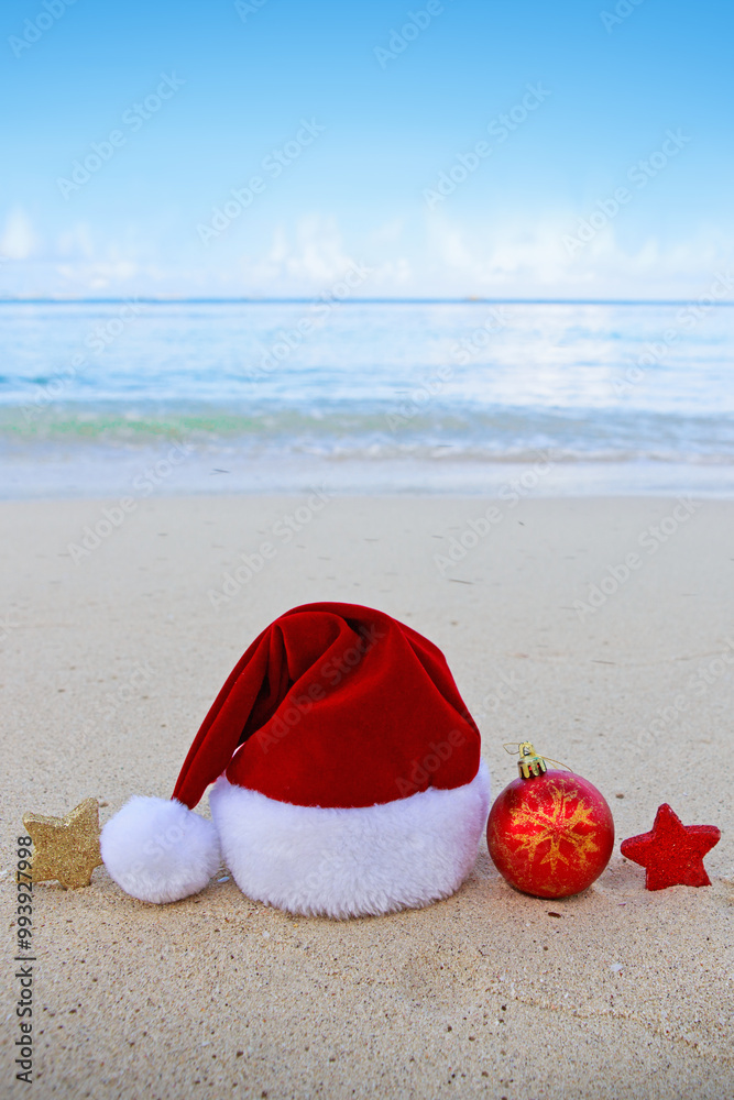 Christmas background with red Santa hat and decorations on Caribbean Beach.