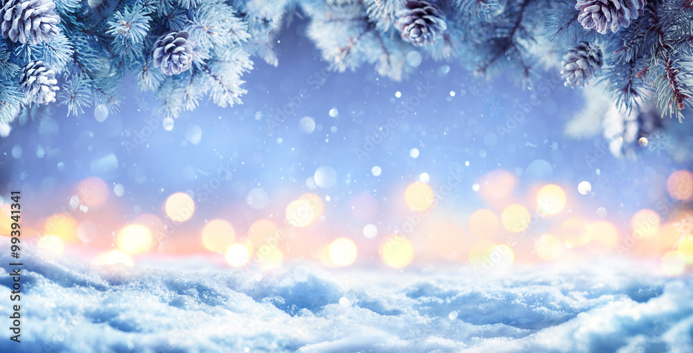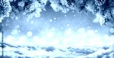 Snow With Bokeh Of Christmas Lights And Fir Branches In Snowy Night - Snowdrift And Snowfall