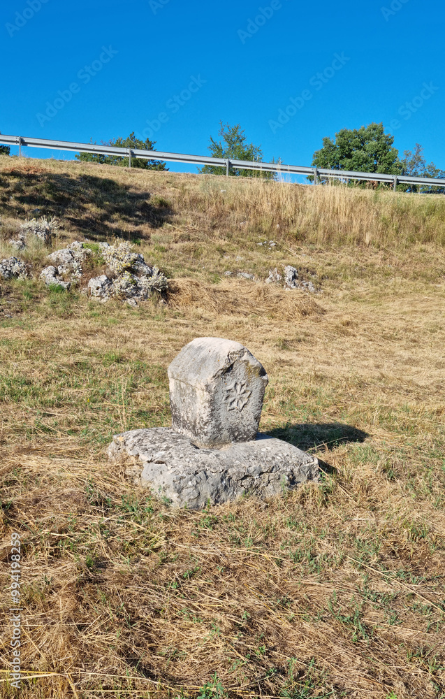 Necropolis Velika and Mala Crljivica (Big and Small Crljivica) near the village of Cista Velika in Croatia with tombstone decorated with intricate carvings