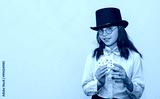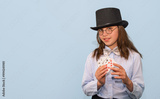 Girl in a magician costume with cards and a top hat. 10-12 years old. space for text.