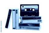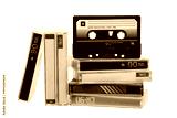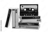 A stack of audio cassettes. Close-up of an audio cassette with a sticker without text. Cassettes for audio recordings and music. Analog storage medium.