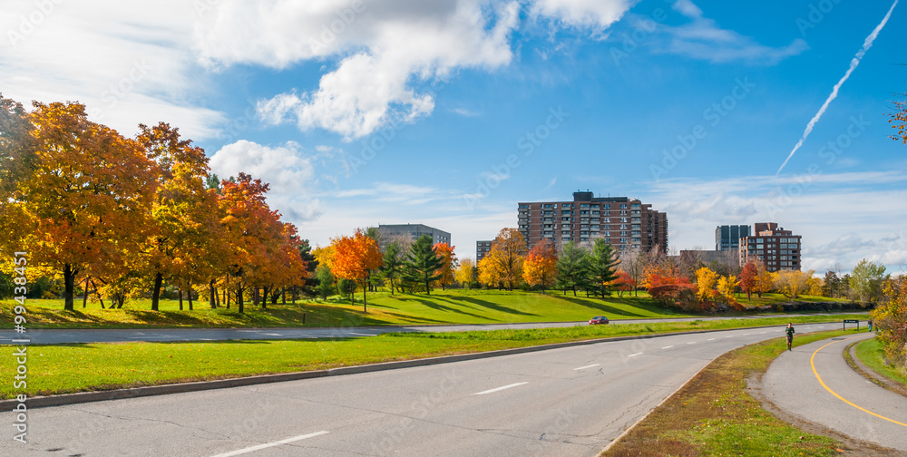Traffic along Ottawa riverside parkway - runners on winding paved pedestrian path. Outing in autumn afternoon sun. Panoramic view following Ottawa River. Apartments & condos along parkway.