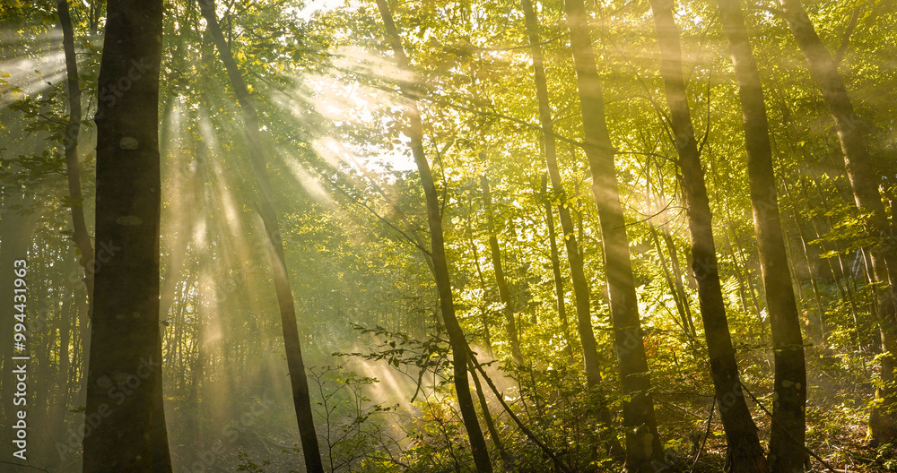 LENS FLARE: Gentle sunbeams filter through thick canopy of green beech trees. Soft light and long shadows stretch across the deciduous forest and perform a stunning play on an early autumn morning.