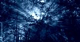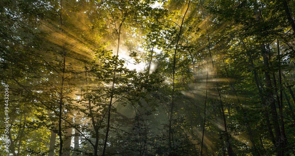 LENS FLARE: Rays of morning sun peep through lush beech treetops and cast a soft, golden glow across the forest. Leafy trees stand tall in morning haze during a stunning play of lights and shadows.