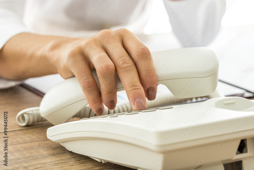 Female hand holding a white landline telephone handset and diali