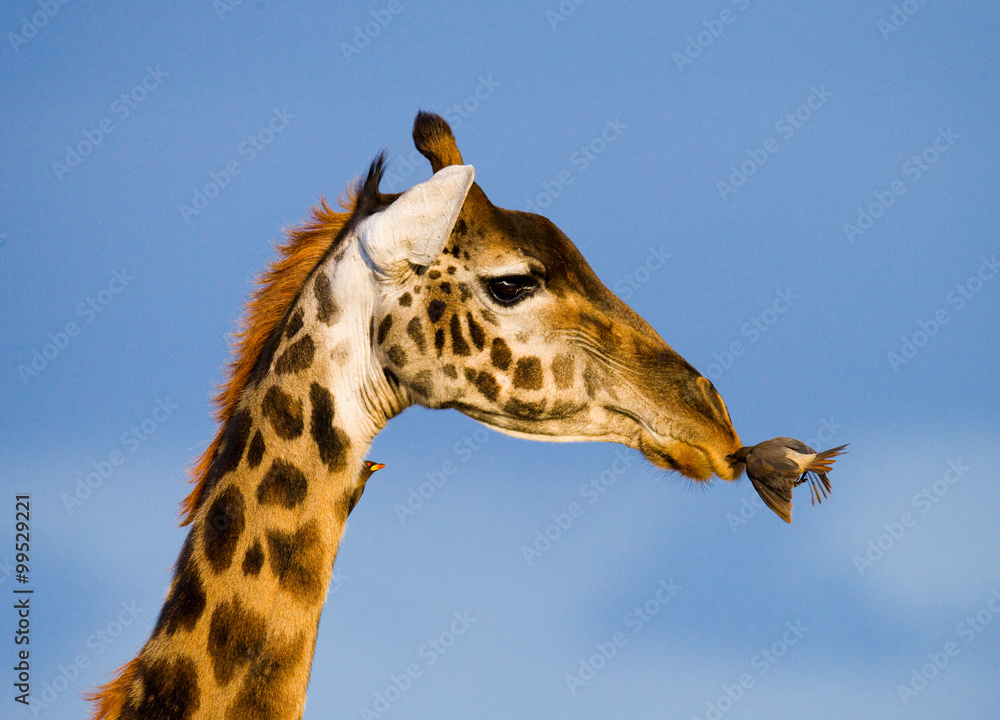 Giraffe with bird. A rare photograph. Kenya. Tanzania. East Africa. An excellent illustration.