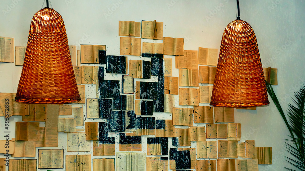 Interior with two lamps, wicker from vine, walls are glued with pages from books