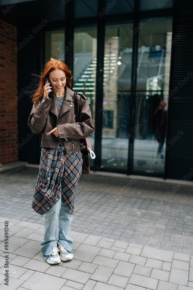 Full length vertical portrait of attractive young woman with flowing red hair enjoying cheerful phone conversation standing on city street on summer day. Smiling redhead female contemporary lifestyle