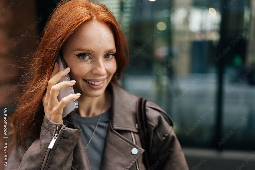Closeup of beautiful young woman with long red hair and freckles chatting on smartphone outdoors, smiling looking at camera. Cute redhead female dressed in leather jacket enjoying conversation outside