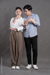 Image of Asian business couple posing on gray background