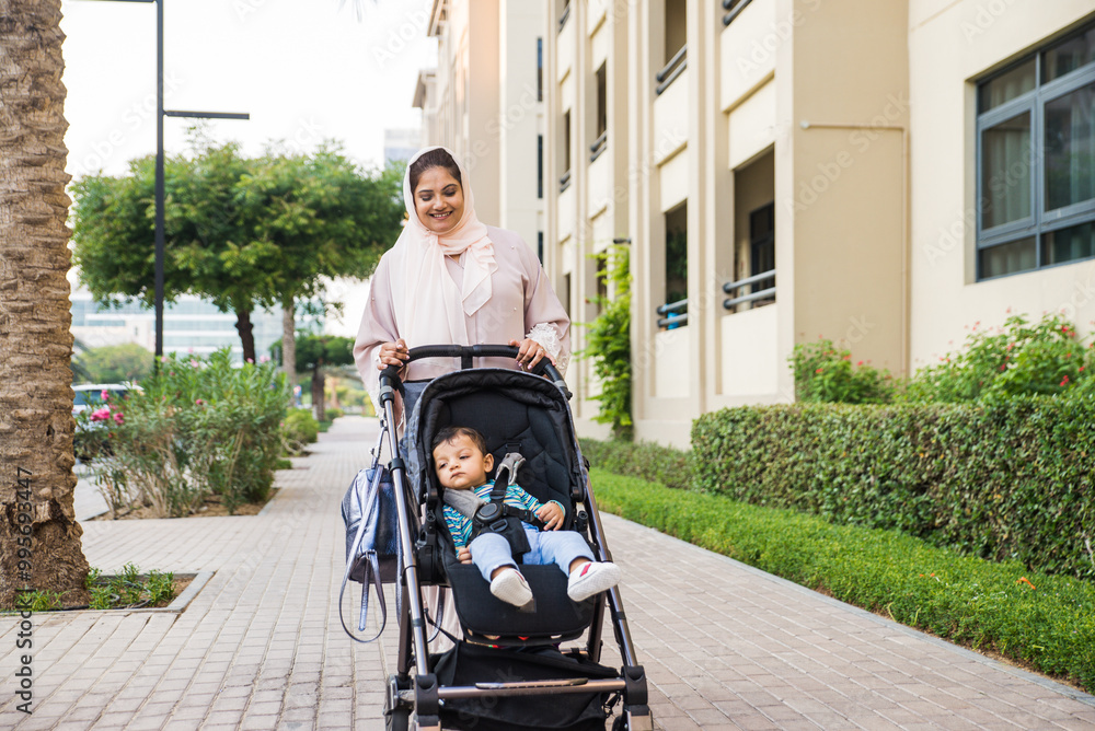 Mother and baby son lifestyle moments in Dubai. Young woman with her kid outdoor. Family concepts in the UAE
