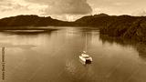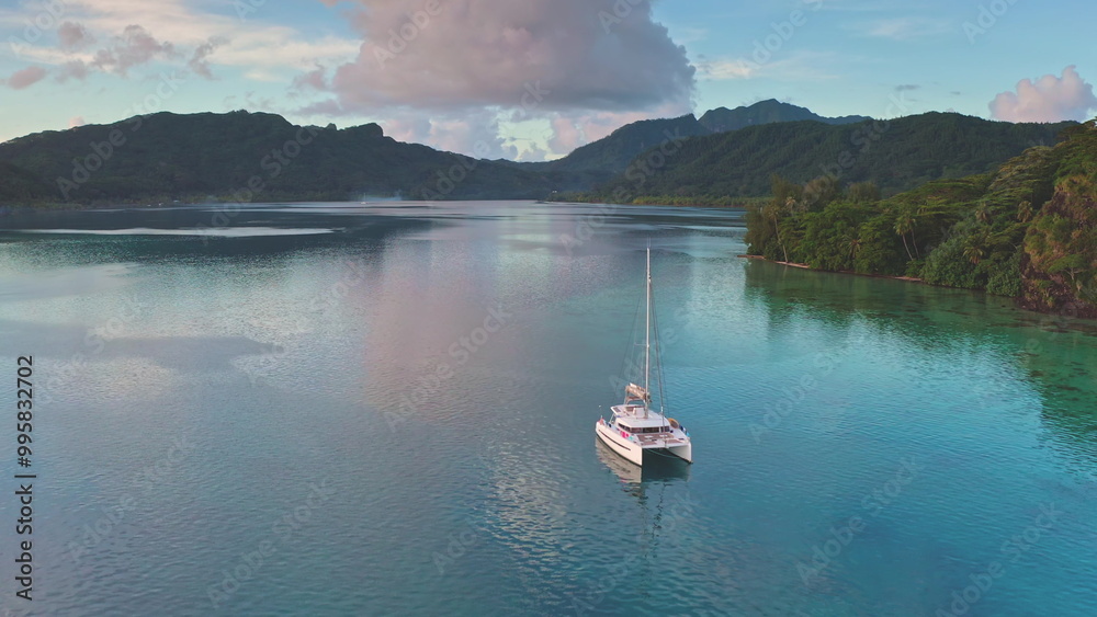 Aerial view catamaran sailing calm turquoise water lagoon near tropical island with lush green mountains and a beautiful sunset in background. Remote wild nature paradise, exotic summer luxury travel
