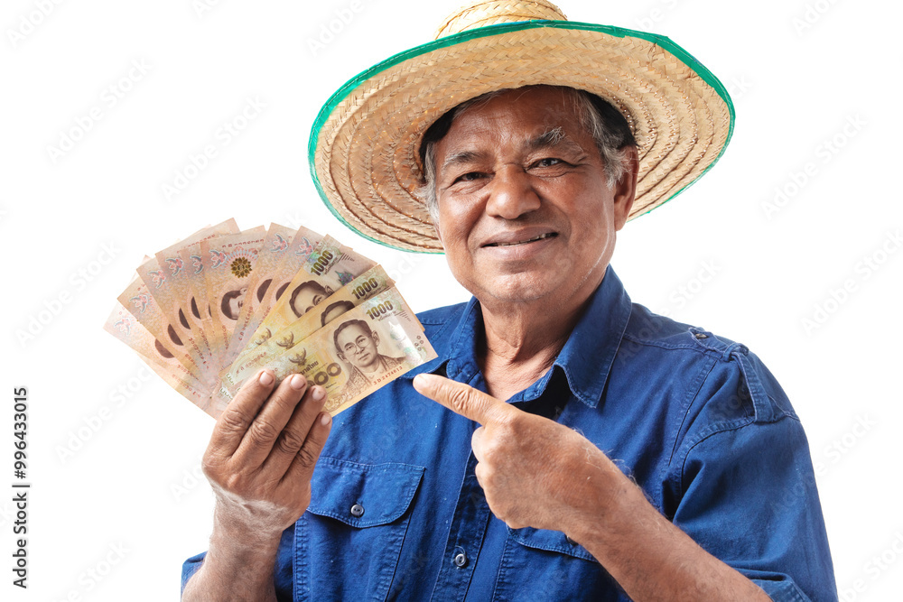 Happy smiling of elderly Asian farmer man wear a hat holding Thai banknotes money isolated on white background.