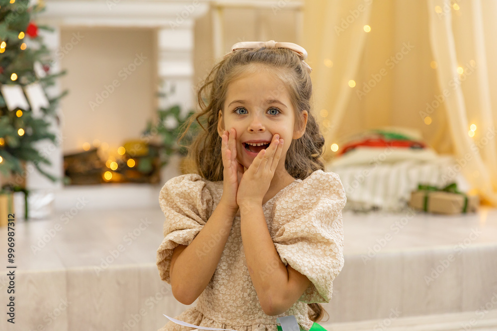 Portrait of surprised cute smiling little toddler girl child on festive bright Christmas decorations background. Looking at camera. Hands near open mouth