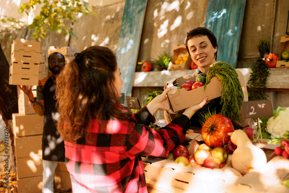 Young woman shopping at a farmers market, selecting fresh, organic produce from a local market stall. Farmer giving cardboard box filled with locally grown healthy fruits and veggies.