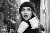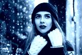 Street portrait of young beautiful woman with long blond hair wearing stylish winter clothes. Model looking up. Female fashion concept. Selective focus. Close up. Magic snowfall effect