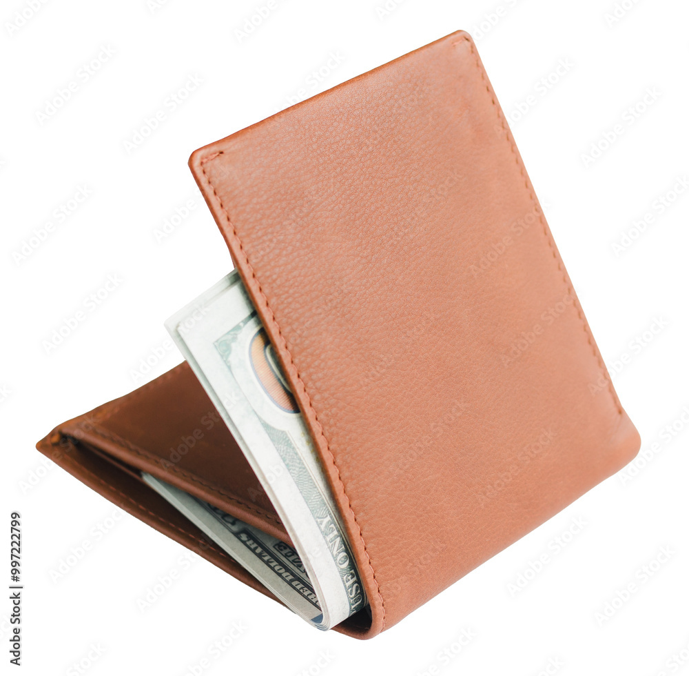 purse or wallet with money dollar bills on a white background. Brown purse with dollar banknotes isolated in the background.