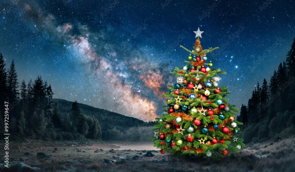 Decorated Christmas tree in nature under the starry night sky. A fantasy composite of festive ornaments in a dreamy landscape with the Milky Way