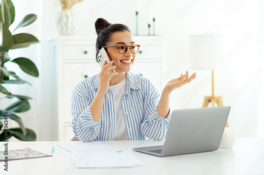 Mobile phone talk. Confident attractive indian or arabian business woman talking by smartphone about strategy with a client or partner while working day on her office with a laptop on the desk, smiles