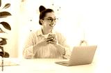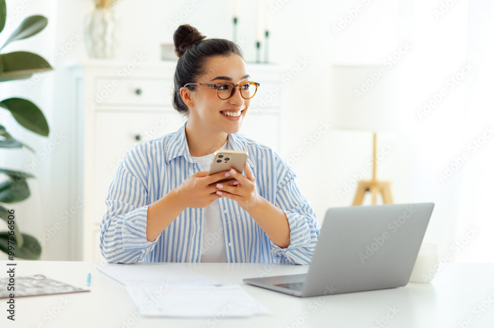 Using gadgets. Happy young caucasian woman with glasses, sitting at a desk with a laptop, uses her smartphone for checking email and work chats, chatting online, looking away, smiling