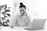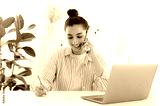 Positive successful young pretty caucasian woman in blue shirt, talking on mobile phone and uses laptop while sitting at her workplace, discuss a project with client, smiles. Smart phone conversation