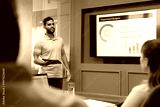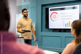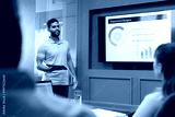 Holding tablet and explaining charts, man presenting department budgets in meeting room
