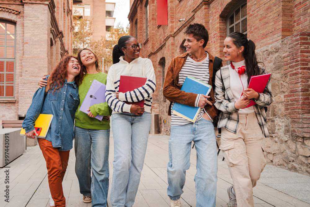 Group of diverse students walking together on campus, smiling and carrying notebooks, highlighting friendship, education, and student life in a university setting. Classmates enjoying school together