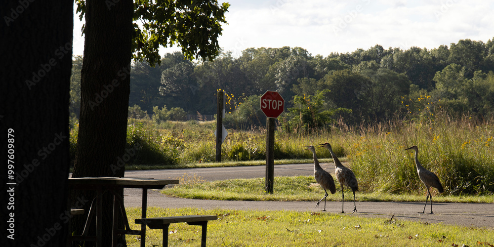 Panorama of three Sandhill Cranes and multicolored wildflowers in autumn at Moraine Hills State Park in McHenry County, Illinois