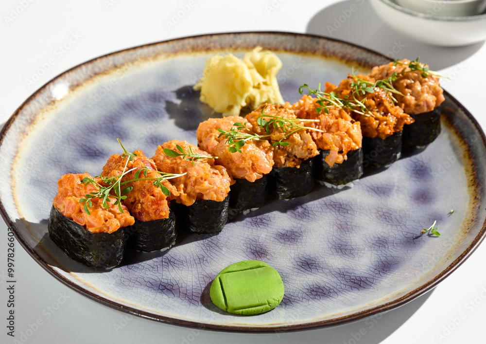 Assorted Gunkan Sushi on a Plate with Vibrant Colors and Artistic Presentation