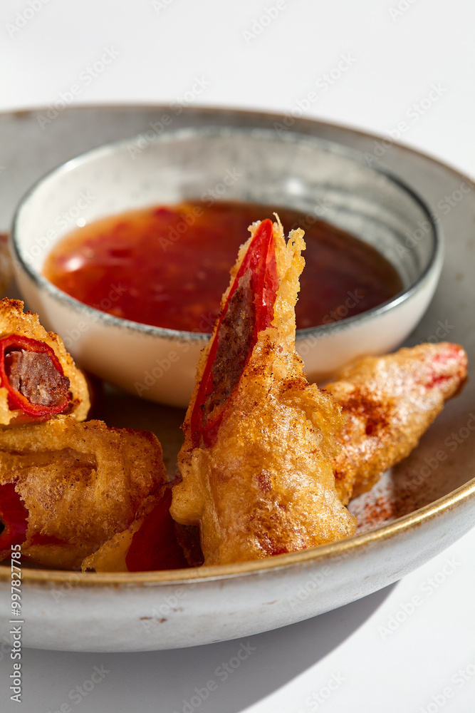 Golden Tempura Chili Peppers with Dipping Sauce Gourmet Food Photography in Vibrant Lighting