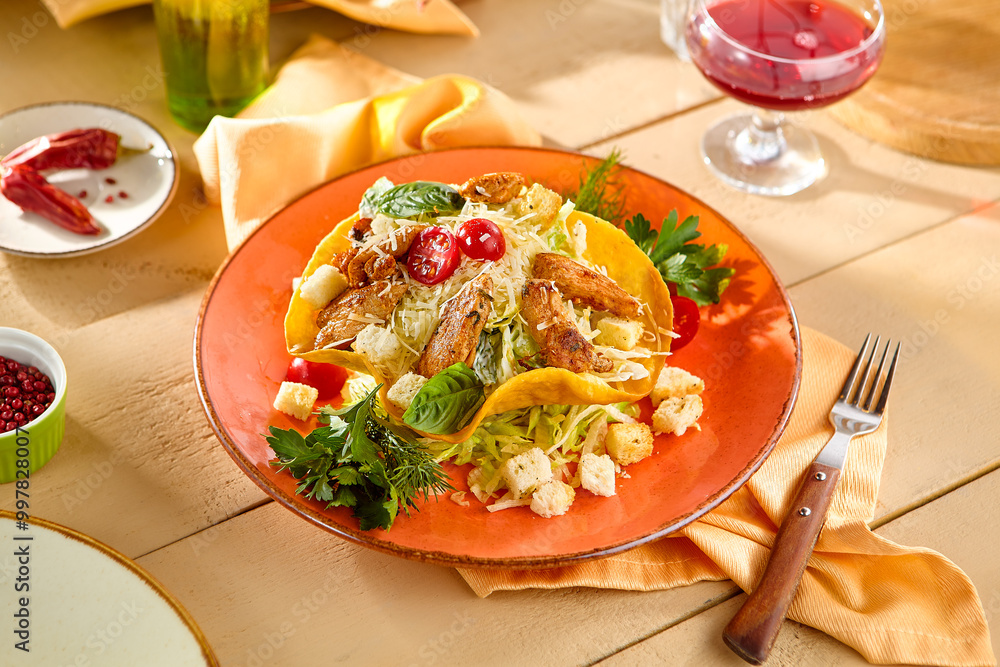 Traditional Caesar Salad in Tortilla Bowl on Rustic Table