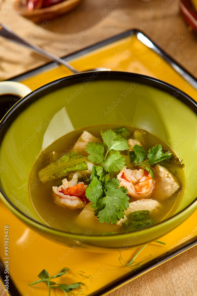 Delicious Shrimp Fish Soup in Green Bowl with Cilantro Garnish and Vegetables