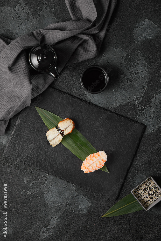 Elegant Sushi Display Featuring Shrimp and Eel Rolls on Black Slate with Minimalist Composition and Subtle Lighting