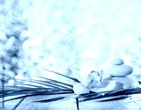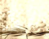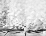 Still life of spa stones on wooden planks surface against bright background