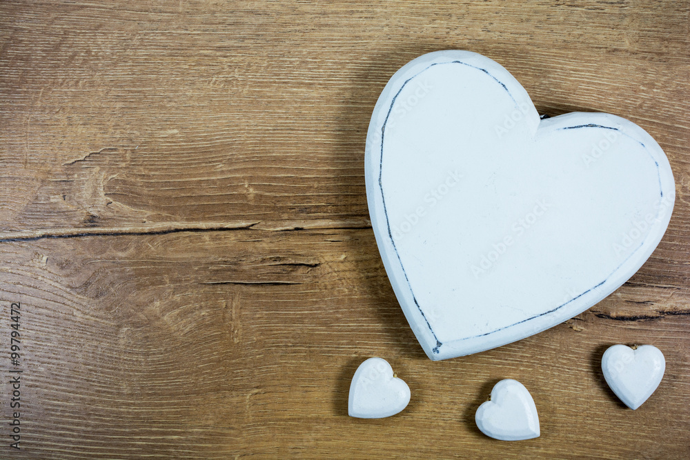 White heart on wooden background with space for text
