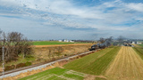 A classic steam locomotive puffs blue-gray smoke as it moves along train tracks, surrounded by lush green fields and farmland. The clear sky enhances the tranquil rural scenery.