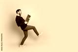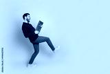 Photo of cool optimistic man wear stylish clothes have fun dance hold keypad isolated on gray color background
