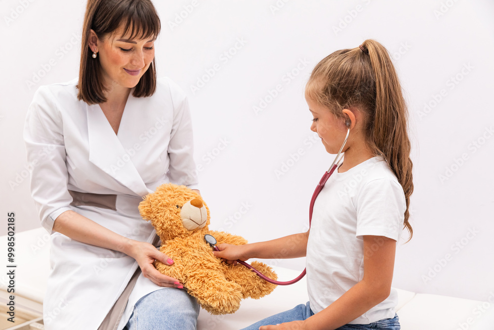 Little child girl plays with plush toy at doctor appointment. Child listens to soft toy with stethoscope. Doctors concept for children, copy space for text. High quality photo, with white background