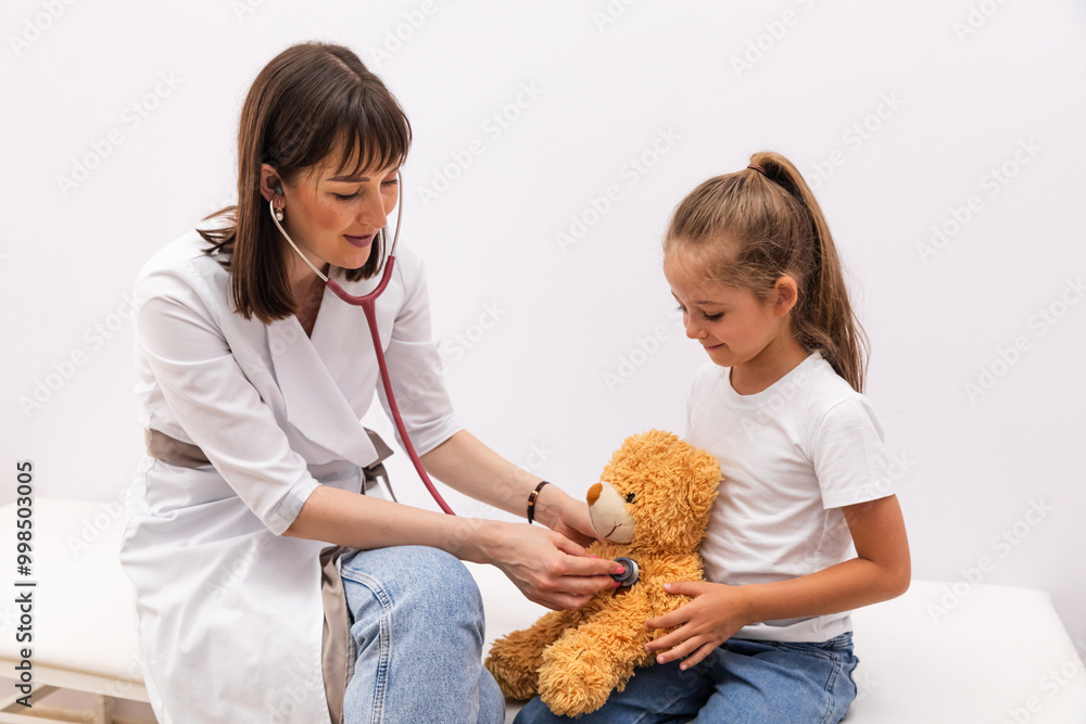 Little child girl plays with plush toy at doctor appointment. Child listens to soft toy with stethoscope. Doctors concept for children, copy space for text. High quality photo, with white background