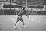 Badminton player focuses on the shuttlecock mid-air during a match on an outdoor court. With his racket raised, he prepares for the next shot, surrounded by an urban and scenic background