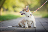 portrait of red and white female pembroke welsh corgi puppy sitting on the road with open mouth in summer park