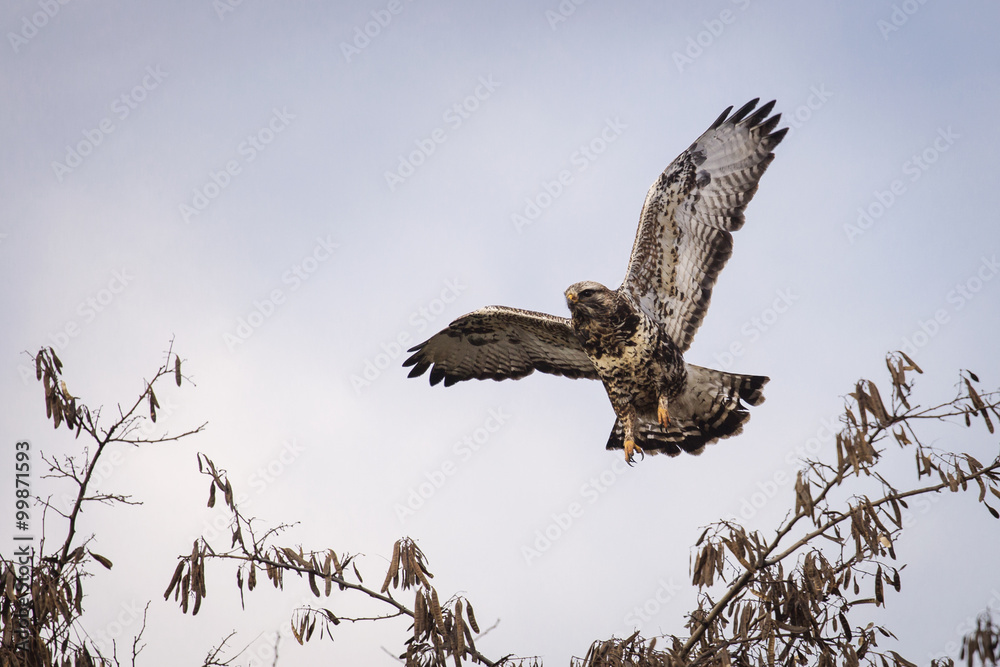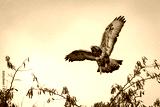 An adult red-tailed hawk flies into the sun on a bright blue sky