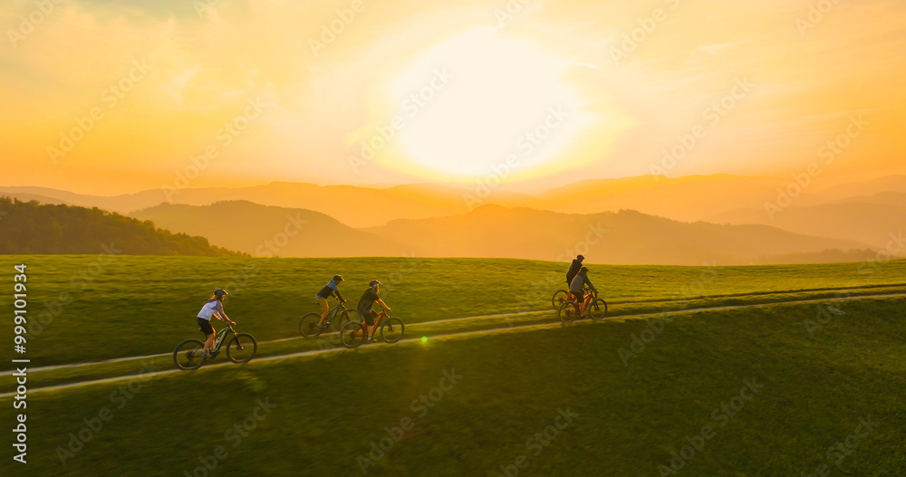 AERIAL: Golden sunbeams shine on a bike trip expedition riding in the picturesque mountains of Slovenia. Flying along five friends mountain biking in the verdant Alps at beautiful autumn sunset.