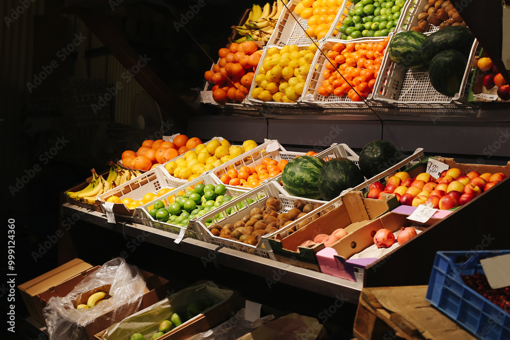 Fruit market display with colorful fruits in crates. Grocery store with oranges, lemons, limes, kiwis, and watermelons. Fresh and vibrant produce at the farmer's market.