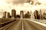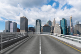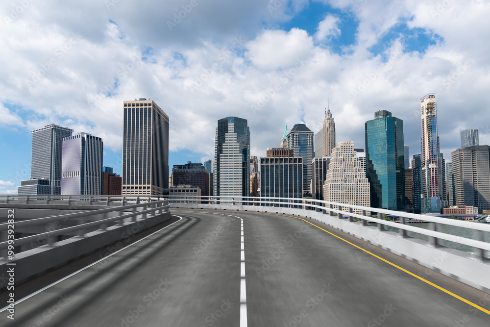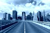 Curved highway with a view of Manhattan skyline under a partly cloudy sky.
