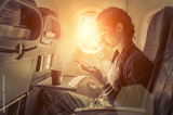 Woman sitting at airplane and looking to mobil phone.