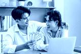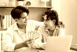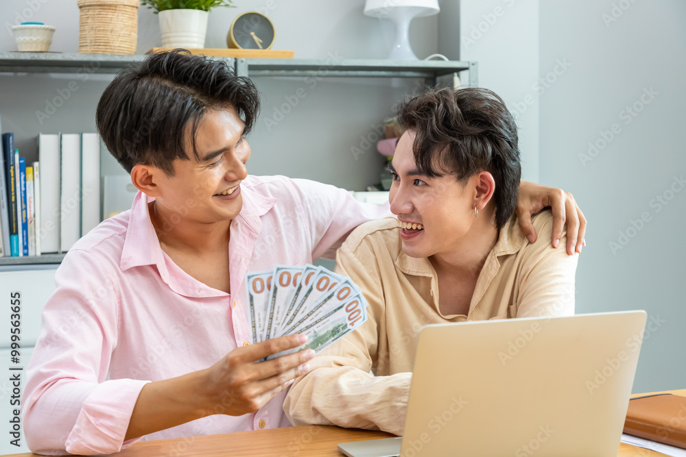 Happy two Asian men gay couple celebrating financial achievement with cash banknote at home