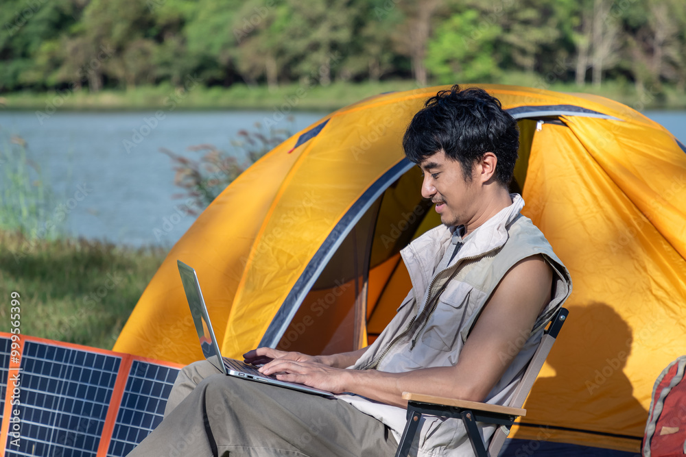 Remote work in nature, young Asian man using laptop while camping by the lake with solar panel and tent for sustainable outdoor lifestyle