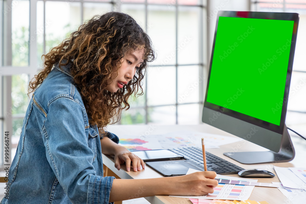 Asian creative female graphic designer working with color palettes on a tablet in modern workspace, with green screen